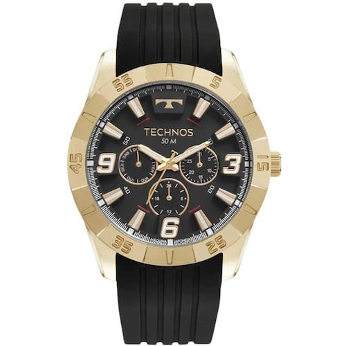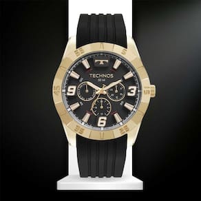 Relógio Masculino Technos Racer 6P29ALU/2P - Dourado Relógio Technos Racer com estética esportiva e aro externo trabalhado em relevos, com marcação dos minutos/segundos. Seu mostrador preto apresenta o clássico T da marca na imponente posição de 12 horas, numeração arábica nas posições de 3/6/9 horas, maquinismo multifunção e toques de cor. Características:ean: 7891530825231Marca: TechnosModelo: 6P29ALU/2PCor da caixa: DouradoMaterial da caixa: AçoCor da pulseira: PretoMaterial da pulseira: SiliconeTipo: CronógrafoFormato: RedondoCor do mostrador: PretoTipo de fecho: FivelaResistência á água: 5ATM Dimensões da Embalagem:Altura: 9cmLargura: 12cmProfundidade: 16cmPeso: 0,400KgGarantia: 12 Meses Ean: 7891530825231