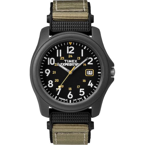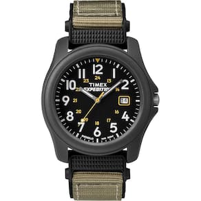 Este relógio de acampamento da Expedição Timex, limpo, simples e de inspiração militar, não mudou muito desde 1918. Fizemos um pouco mais leve, adicionamos uma cinta fast wrap de nylon com prendedor, e nossa assi Indiglo luz noturna.