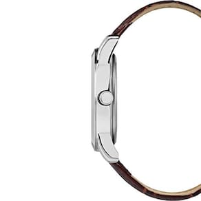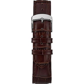 Atemporal e sofisticado, este relógio é ótimo para o uso diário e possui uma caixa prateada, mostrador azul e pulseira de couro marrom com padrão de crocodilo.