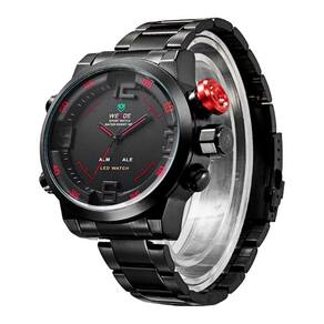 Marca: Weide Categoria: AnaDigi Analógico: Sim 1 Horário Ponteiros Fluorescentes: Sim Digital: Sim 1 Horário Calendário: Sim Despertador: Sim Mostra o Dia da Semana: Sim Mostra o Dia do Mês: Sim Cronômetro: Não Contador Regressivo: Não Luz: Sim Cor da Iluminação: Vermelho Resistente à Água: 3 ATM Resiste a imersões breves
