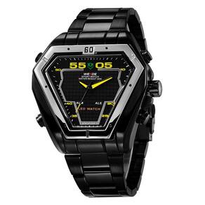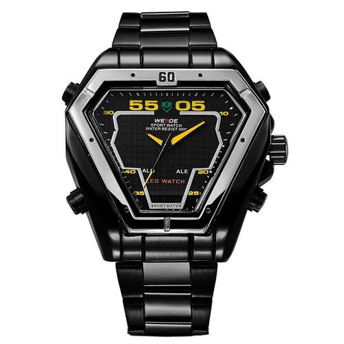 Relógio Masculino Weide AnaDigi WH1102B - Preto e Amarelo Relógio Masculino Weide AnaDigi WH1102B - Preto e Amarelo Marca: Weide Categoria: AnaDigi Analógico: Sim 1 Horário Ponteiros Fluorescentes: Não Digital: Sim 1 Horário Calendário: Sim Despertador: Sim Mostra o Dia da Semana: Não Mostra o Dia do Mês: Sim Cronômetro: Não Contador Regressivo: Não Luz: Sim Cor da Iluminação: Vermelho Resistente à Água: 3 ATM Resiste a imersões breves - Respingos: Sim - Chuva: Sim - Lavar Carro: Sim - Lavar Louça: Sim - Natação: Não - Mergulho: Não Característica do Vidro: Cristal Mineral Tipo de Fecho: Dobrável com Botão e Trava Cor da Caixa: Preto Material da Caixa: Metal Banho IP Formato da Caixa: Quadrado Comprimento da Caixa: 49,70 mm Largura da Caixa: 52,20 mm Espessura da Caixa: 15,50 mm Cor da Pulseira: Preto Material da Pulseira: Metal Largura da Pulseira: 20,80 mm Comprimento Máximo da Pulseira: 230,00 mm Alimentação: Bateria Interna Peso Líquido: 0,169 Kg Modelo: WH1102B Cor Predominante: Preto Cor Diferencial: Amarelo Garantia: 12 Meses Conteúdo da Embalagem: 01 Relógio 01 Embalagem 01 Termo de Garantia