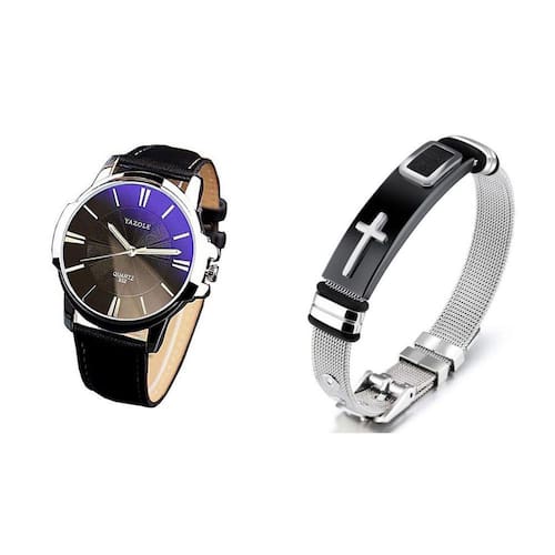 Kit relógio yazole 332 preto + pulseira em aço com cruz características relógio: quartzo movimento 60 movimentos material da pulseira couro material da caixa metal tipo de display analógico tamanho da caixa 4,6 cm de diâmetro aproximadamente espessura da caixa 1,5 cm comprimento da pulseira 24 cm pulseira em couro de alta qualidaderelógio moderno, estiloso e luxuoso não é resistente à água.produto não acompanha estojo/caixa.embalado em saco próprio do fabricante. características pulseira em açolinda pulseira masculina bracelete em malha de aço inoxidável 316l mais resistente à corrosão e antialérgico com fino e cuidadoso acabamento, fruto de um design diferenciado, proporciona conforto ao usar, além de ser uma peça de destaque e extremamente versátil ao possibilitar combinações em diversas ocasiões. o detalhe com a cruz prateada sobre uma chapa esmaltada preta, trazem o contraste na medida para o acabamento da peça. logo acima da cruz há um retângulo preenchido em couro na cor preta.possui ajuste como uma pulseira de relógio, não precisa cortar furos de 16,5cm a 21cm largura da pulseira: 1 cmtamanho total da pulseira: 23 cmpeso: 26 gramas