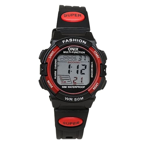 Relógio Menino Onix Digital IT-619 (0128) Preto e VermelhoMarca: Onix Categoria: Digital Analógico: Não Digital: Sim (1 Horário) Calendário: Sim Despertador: Sim Mostra o Dia da Semana: Sim Cronômetro: Sim Luz: Sim Cor da Iluminação: VerdeResistente à Água: 5 ATM (Pode ser utilizado para nadar no raso, por pouco tempo submerso) - Respingos: Sim - Chuva: Sim - Lavar Carro: Sim - Lavar Louça: Sim - Natação: Sim - Mergulho: Não Característica do Vidro: Acrílico Tipo de Fecho: Fivela Cor da Caixa: Preto Material da Caixa: Plástico Formato da Caixa: Redondo Diâmetro da Caixa: 34,00 (mm) Espessura da Caixa: 14,50 (mm) Cor da Pulseira: Preto Material da Pulseira: Plástico Largura da Pulseira: 14,00 (mm) Comprimento Máximo da Pulseira: 230,00 (mm) Alimentação: Bateria Interna Peso Líquido: 0,025 Kg Modelo: IT-619 (0128) Cor Predominante: Preto Cor Diferencial: Vermelho Garantia: 12 MesesConteúdo da Embalagem: 01 Relógio 01 Embalagem 01 Termo de Garantia