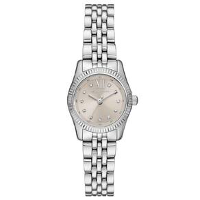 Mecanismo: Analógico (Quartzo) Gênero: Feminino Visor: Perolado com cristais Vidro: Cristal mineral Material da Caixa: Aço inoxidável Prova d'água: 50m Diâmetro da caixa: 26mm Espessura da caixa: 8mm Largura da pulseira: 14mm Pulseira: Prata Peso: 65g Garantia: 1 ano pela fabricante
