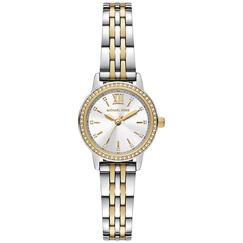 MKO1172/1KN Bicolor O MKO1172/1KN combina delicadeza e charme moderno com sofisticação. Com caixa pequena de 26mm e pulseira bicolor elegante prata e dourado , este acessório feminino exibe um mostrador prata bezel cravejado de cristais, adicionando brilho refinado. Resistente a até 50m, traz durabilidade sem perder o estilo. Compacto, leve e deslumbrante, é perfeito para quem busca um acessório elegante, ideal para o dia a dia e ocasiões especiais. Especificações Técnicas Mecanismo: Analógico Quartzo Gênero: Feminino Visor: Branco Vidro: Cristal mineral Material da Caixa: Aço inoxidável Prova d'água: 50m Diâmetro da caixa: 26mm Largura da pulseira: 12mm Pulseira: Prata e dourado Peso: 65g : 1 ano pela fabricante Michael Kors Marca: Não Informado