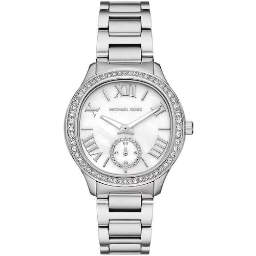 O Relógio Sage Pavé MK4807, um ícone de elegância atemporal. Com caixa de 38?mm em aço prateado, mostrador de madrepérola e bezel com cristais, ele exala sofisticação com discrição. A pulseira delicada em aço 18mm e o fecho de garantem conforto e estilo refinado.