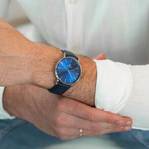 Relógio Minimalista Saint Germain a caixa é de metal prateada e o mostrador azul shine, vidro com mineral endurecido com alta resistência.
