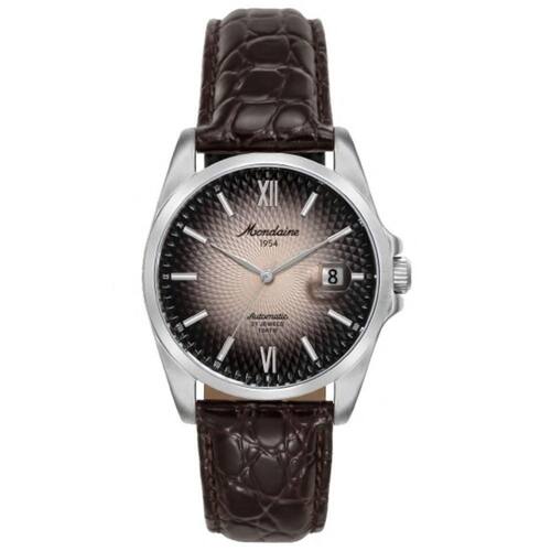 Mecanismo: Automático Miyota Japan 8215 (reserva de marcha 42h) Gênero: Masculino Visor: Preto e Marrom texturizado com efeito fade Vidro: Cristal Mineral Funções: Automático e Calendário Prova d'água: 100m Diâmetro da caixa: 40 mm Largura da pulseira: 18 mm Tamanho do Vidro: 36 mm Característica: Pulseira em couro crocodilo marrom, Fundo Rosqueado, coroa assinada, 21 joias. Garantia: 12 meses pelo fabricante Mondaine