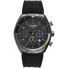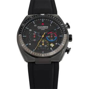 Mecanismo: Quartzo Gênero: Masculino Visor: Preto Vidro: Cristal Mineral Funções: Cronógrafo e Calendário Prova d'água: 50m Diâmetro da caixa: 46 mm Largura da pulseira: 27 mm Tamanho do Vidro: 36 mm Garantia: 12 meses pela fabricante Mondaine