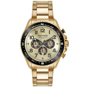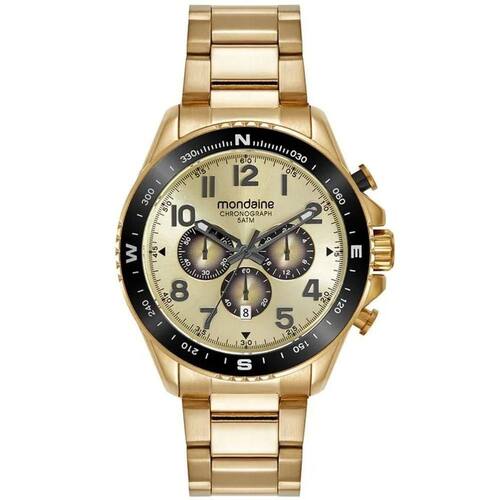 Mecanismo: Quartzo Gênero: Masculino Visor: Dourado Vidro: Cristal Mineral Funções: Cronógrafo e Calendário Prova d'água: 50m Diâmetro da caixa: 48 mm Largura da pulseira: 22 mm Tamanho do Vidro: 37 mm Garantia: 12 meses pela fabricante Mondaine