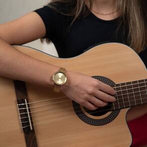 Características Formato do Relógio: Redondo Composição do Vidro: Acrílico Material da Caixa: Aço Inox Cor da Caixa: Dourado Cor do mostrador: Dourado Material da Pulseira: Aço Inox Cor da Pulseira: Dourado Mecanismo: Analógico Quartz