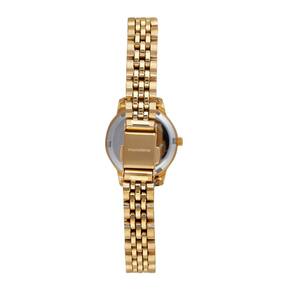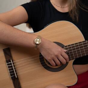 Características Formato do Relógio: Redondo Composição do Vidro: Cristal mineral Material da Caixa: Aço Inox Cor da Caixa: Dourado Cor do mostrador: Dourado Material da Pulseira: Aço Inox Cor da Pulseira: Dourado Mecanismo: Analógico Quartz