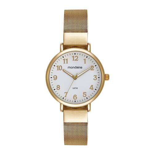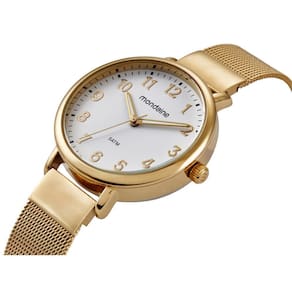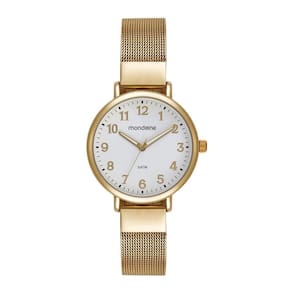 Relogio Mondaine Feminino Ref: 32918lpmvde1 Casual Mesh Dourado DESCRIÇÃO DO PRODUTO: Caixa de Metal Pulseira de Malha de Aço Mesh Vidro de Cristal Mineral Fundo Rosqueado Resistente à Água 5 Atm Diâmetro / Largura da Caixa: 34.00 MM Função: Analógico Alimentação do Maquinário: Bateria Mostrador branco com todos os números de 1 Ano Marca: Não Informado