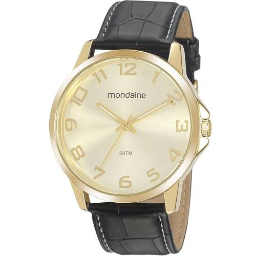 Relógio Mondaine Masculino 99517GPMVDH1 Couro Este relógio contém visor champagne e caixa de metal dourado com função analógico. A pulseira trabalhada em material sintético preto, possui fecho por fivela. Esse relógio possui a caixa em 3,9 cm de tamanho. Marca: Não Informado