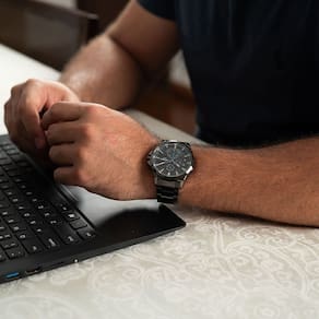 Características Formato do Relógio: Redondo Composição do Vidro: Cristal Mineral Material da Caixa: Aço Inox Cor da Caixa: Preto Cor do mostrador: Preto, azul Material da Pulseira: Aço Inox Cor da Pulseira: Preto Mecanismo: Analógico - Quartz
