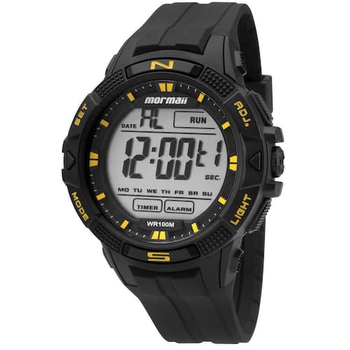 Relógio Mormaii Acqua Mo5001/8y Preto Mo5001/8y Relógio Mormaii da Linha Acqua a prova dágua 100m. Modelo digital na cor preta com pulseira e caixa em polímero 50mm. Produto com display positivo e detalhes no aro externo em amarelo. Gênero - Masculino Mostrador - Digital Cor da Caixa - Preto Material da Pulseira - Polímero Material da Caixa - Polímero Formato da Caixa - Redondo Cor do Mostrador - Cinza Tipo de Fecho - Fivela Garantia - 12 meses Cor da Pulseira - Preto Largura da Caixa (cm) - 5 Resistência à Água - 10 ATM Conteúdo da Embalagem - - 1 Relógio Mormaii Wave MO5001/8Y Preto meli_title - Relógio Digital Masculino Mormaii Wave Preto Pronta Modelo_ML - Relógio Digital Masculino Mormaii Wave MO5001/8Y com Pulseira de Polímero Preto Caixa de 50 Milímetros Vidro de Acrílico A Prova D'água até 100 Metros e 12 Meses de Garantia em Toda Rede de Assistência Technos no . Cor - Preto Tamanho - Grande Gênero - Masculino