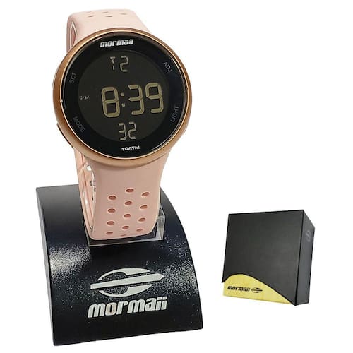Marca: Mormaii Modelo: MO7700AF/8T Tipo de relógio: Digital Gênero: Feminino Cor da caixa: Rosé Cor da pulseira: Rosa Estilo: Casual Alarme: Sim Cronômetro: Sim Calendário: Sim Luz: Sim Resistência à água: Sim – 10 ATM = 100 metros Tipo de fecho: Fivela Simples Material da Caixa: Polímero Material da Pulseira: Silicone Características do vidro: Acrílico Tamanho da caixa: 43 mm Espessura da caixa: 12 mm Comprimento da pulseira: 23 cm Largura da pulseira: 21 mm Tampa do fundo: Parafusado Peso: 45 Gramas Alimentação: Bateria Garantia do Fabricante: 12 meses Fabricante: Technos da Amazônia Ind e Com S/A