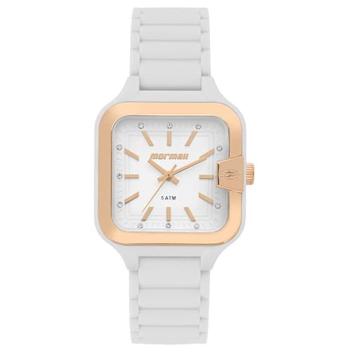 Com caixa quadrada de 34mm e acabamento em branco com detalhes rosé, o relógio apresenta um design sofisticado e feminino. O mostrador branco com marcadores dourados e cristais aplicados traz brilho na medida certa, destacando o equilíbrio entre casualidade e elegância.