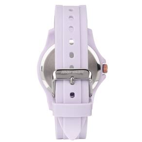 Relógio MormaiI Luau com caixa lilás de polímero 40mm, mostrador rosé analógico e pulseira lilás de silicone com aro rosé. Inspirado em um dia na praia, ele é leve e confortável; possui detalhes metalizados nos marcadores de hora e 50 metros de resistência à água.