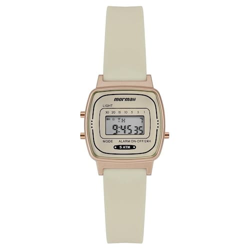 Relógio Acqua NXT conta com um design inovador e cheio de estilo. Com caixa de 30mm na cor rosé, feita de polímero, e pulseira de silicone na cor bege, o relógio conta com várias funcionalidades, como cronômetro, alarme, luz noturna e display digital de fácil leitura. Além disso, seu mostrador na cor bege é de LCD positivo e conta com a resistência à água de 50 metros.