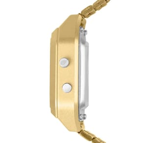 Relógio Vintage apresenta um novo modelo, com pulseira de aço inoxidável em 5 links banhado em dourado. A linha traz um relógio único, que apresenta mostrador na cor preto com duas opções de visualização: digital e analógico. Além disso, conta com display com indicação de dia, semana e mês, incluindo alarme e cronômetro. Apresenta resistência à água de 50 metros.