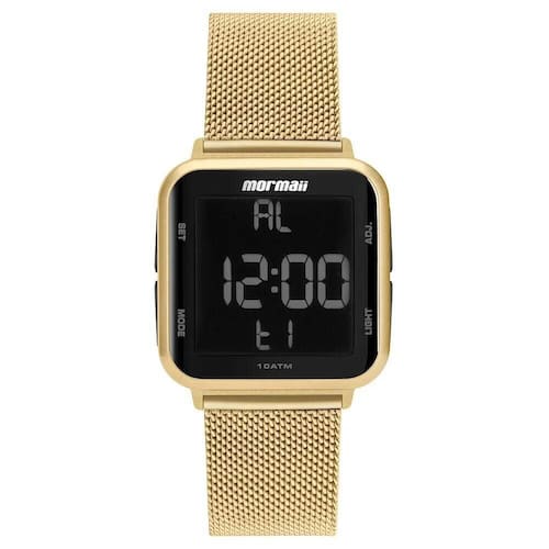Linha: Lab Digi Garantia: 12 meses em toda rede autorizada MORMAII Conteúdo da embalagem: 1 relógio, manual, certificado de garantia Fornecedor: Technos Indústria e Comércio da Amazônia S/A EAN / Código de barras: 7891530659010 Características Vidro: Acrílico Material da caixa: Polímero Cor da caixa: Dourado Material da pulseira: Aço trança mesh Cor da pulseira: Dourado Diâmetro da caixa: 38 mm Mecanismo: Digital Funções: Calendário / Alarme / Dual Time / Cronógrafo / Timer Resistência à água 10 atm / Consulte sempre o manual antes de molhar seu produto