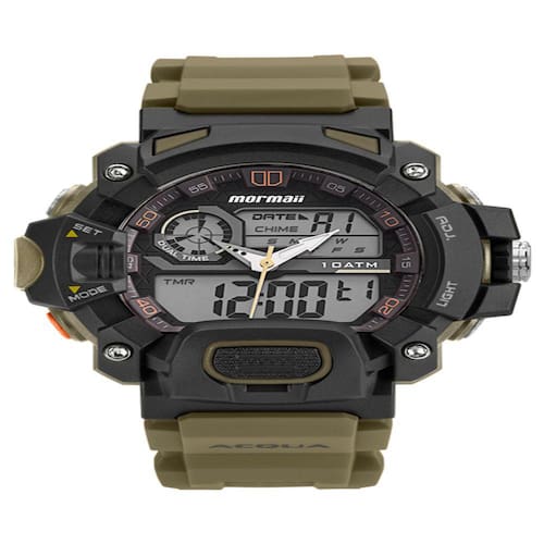 Relógio Mormaii da Linha Acqua a prova dágua 100m. Modelo digital na cor cáqui com pulseira e caixa 54mm em polímero. Produto com display positivo e detalhes em preto no aro interno. Item que compõe a nossa coleção Acquaforce, que transmite a ideia de força e resistência nas nossas caixas super robustas.