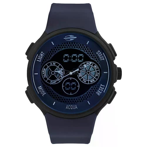 A caixa de 46mm traz presença no pulso sem abrir mão do conforto, enquanto a pulseira em silicone azul escuro proporciona excelente ajuste e resistência. O mostrador digital-analógico exibe múltiplas funções com excelente legibilidade, realçado por detalhes em azul e preto que reforçam sua pegada esportiva.