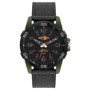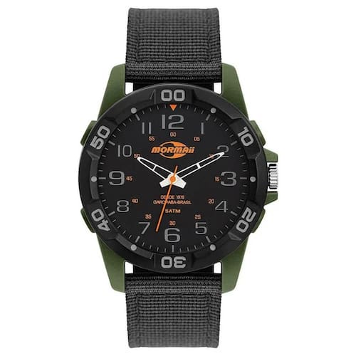 Relógio Mormaii On the Road com design casual e mostrador analógico todo em preto com caixa 44 mm em verde musgo. Conta uma pulseira de Nylon preta maleável e confortável, além do passador em couro marrom dando um toque especial no seu pulso