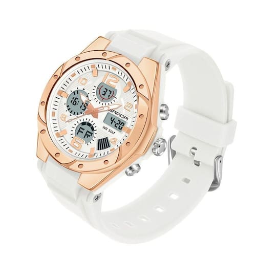 Enriquecido com uma exibição digital LED clara e janela de data, o relógio oferece a conveniência do tempo duplo 12/24 horas, ampliando suas opções de estilo. Pensado para atender ao espírito dinâmico das mulheres modernas, combina beleza e funcionalidade harmoniosamente.