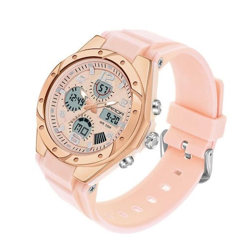 Enriquecido com uma exibição digital LED clara e janela de data, o relógio oferece a conveniência do tempo duplo 12/24 horas, ampliando suas opções de estilo. Pensado para atender ao espírito dinâmico das mulheres modernas, combina beleza e funcionalidade harmoniosamente.