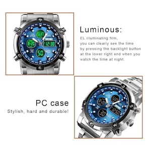 Relógio multifuncional: este relógio digital tem um estilo fino e elegante, funções simples e fáceis de operar, cronógrafo, alarme, horário duplo, luz de fundo EL, interruptor de 12/24 horas e contagem regressiva. Atenda às suas necessidades diárias