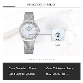 FUNÇÕES ESPECIFICAÇÕES:Exibição AnalógicaHoras, Minutos e SegundosCalendárioResistência à água: 3ATM - Ver TabelaMaterial da caixa: Metal/AçoMaterial da pulseira: AçoDiâmetro da caixa mostrador : 3.2 cm 32 mm Espessura da caixa mostrador : 0.8 cm 8mm Comprimento da pulseira: 22.0 cm 220mm Largura da pulseira: 2.0 cm 20mm Peso: 54gObservações: Antes de utilizar em atividades aquáticas consulte as especificações da tabela de resistência à água. Não pressionar os botões quando em contato com água.Não utilizar em contato com água quente ou morna. Evite que o relógio tenha contato com produtos químicos.Conteúdo da Embalagem:1 Relógio2 Manual de Instruções3 Caixa Lisa