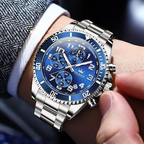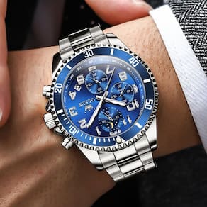 - Relógio azul masculino: bisel rotativo unidirecional. O design do cronômetro e multi-agulha aumenta a praticidade do relógio. Design atraente de três olhos, mostrador pequeno e cronometrado, mostrador 24H. A clássica janela inferior da fase da lua é um relógio clássico para homens cavalheiros.