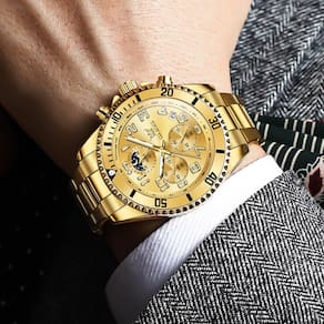 - Relógio dourado para homens: bisel giratório unidirecional, o design do cronômetro e multi-agulha aumenta a praticidade do relógio. Design atraente de três olhos, mostrador pequeno e cronometrado, mostrador 24H. A clássica janela inferior da fase da lua é um relógio clássico para homens cavalheiros.