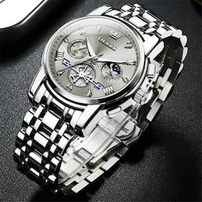 OLEVS Relógio masculino executivo com mostrador diurno, mostrador verde/preto/branco/azul, volante multifunções luminoso, relógio de pulso masculino de aço inoxidável, G2856-prata-cinza, Relógio - Relógio masculino de luxo: este relógio é feito de mostrador grande clássico e movimento de quartzo estável. O vidro revestido duro é resistente a arranhões e o fecho borboleta garante uso confortável. Relógio masculino com design esqueletizado delicado da fase da lua e turbilhão, melhora o grau do relógio - Detalhes do relógio: o diâmetro do espelho é de 42 mm, a espessura da caixa é de 11,5 mm, o comprimento da pulseira é de 200 mm. o comprimento do relógio pode ser ajustado, o peso do relógio é de 129 g - Relógio luminoso: brilhar o relógio sob luz forte por 30 a 40 segundos pode ativar a função luminosa, o que traz a você uma nova experiência visual à noite. Instruções detalhadas para ajustar a hora e o calendário estão incluídas no manual do proprietário - Presente elegante: Design moderno e elegante para todos os homens que se preocupam com qualidade e estilo. Relógios masculinos multifuncionais e elegantes são adequados para qualquer ocasião, incluindo festas, trabalho, vida diária e encontros - Relógio masculino à prova d'água: impermeável para o dia a dia, impermeável até 30 m, geralmente resistente a respingos ou breve imersão em água, mas não é adequado para nadar ou tomar banho