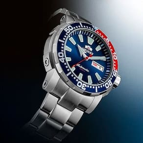 Funções: aro rotativo unidirecional, calendário duplo, pulseira de silicone na cor azul e ferramentas para troca acompanham este modelo