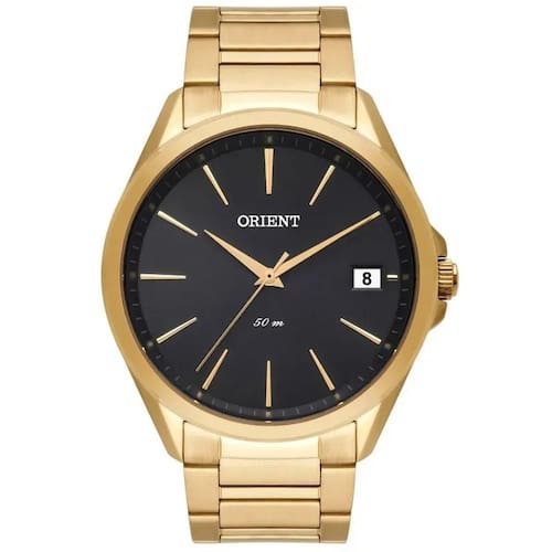 Características - Analógico / Quartz - Coroa: Simples - Tampa posterior : Pressão - Resistência à água : 50m - Vidro : Cristal Mineral - Mostrador Grafite com detalhes dourado - Material da caixa : Aço dourado - Material da pulseira : Aço dourado