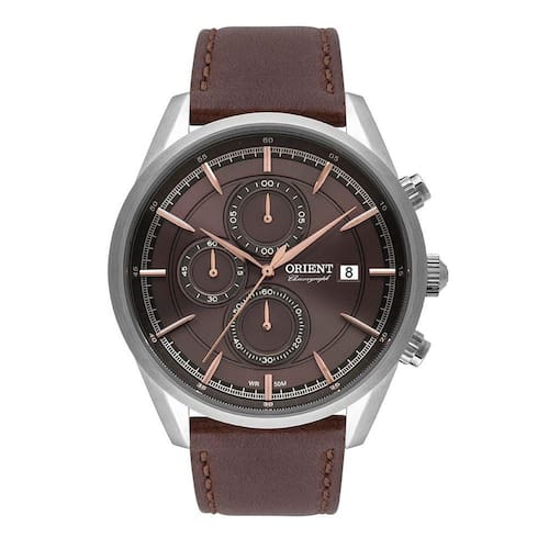 Analógico Gênero: MasculinoVisor: MarromVidro: Cristal MineralFunções: CronógrafoPressão: 50MCaracterísticas: com caixa Aço e pulseira CouroDiâmetro da caixa: 45 mm