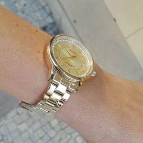 Fabricado em aço inox, esse relógio possui uma caixa dourada com 36 mm de diâmetro medida sem a coroa e 8,8 mm de espessura. Sua pulseira também é em aço inox dourado e possui ajuste para se adaptar perfeitamente ao pulso feminino, com comprimento de 22 cm.