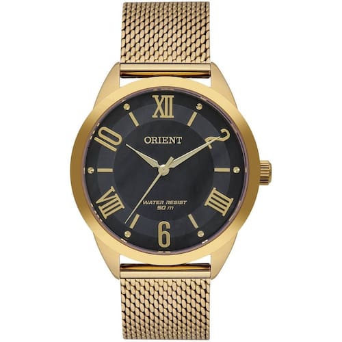 Relógio Orient Feminino Ref: Fgss0206 P1kx Casual Dourado DESCRIÇÃO DO PRODUTO: Caixa: Aço Pulseira: Malha de Aço Mesh Medida da caixa: 38MM Vidro: Cristal Mineral Alimentação do maquinário: Bateria Resistência à água: 50m Funções: Analógico, Mostrador Madreperola Preto com Números e Algarismos Romanos em Dourado Fundo Rosqueado