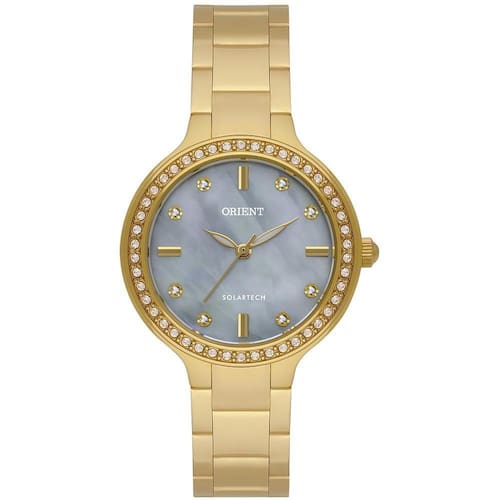 Relógio Orient Feminino Ref: Fgss0229 G1kx Casual Solar Dourado DESCRIÇÃO DO PRODUTO: Caixa: Aço Pulseira: Aço Medida da caixa: 32MM Vidro: Cristal Mineral Alimentação do maquinário: Energia Solar Resistência à água: 30 m Funções: Analógico, Solar Mostrador Madreperola Cinza com pedras Aro externo com pedras Fundo de Pressão
