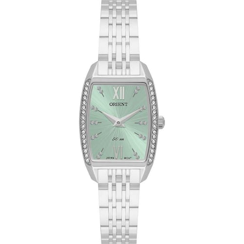 Relógio Orient Feminino Ref: Lbss0092 F3sx Retangular Prateado DESCRIÇÃO DO PRODUTO: Caixa: Aço Pulseira: Aço Medida da caixa: 21MM x 24MM Vidro: Cristal Mineral Alimentação do maquinário: Bateria Resistência à água: 50m Funções: Analógico Mostrador Verde Claro com Algarismos Romanos Aro externo com pedras Fundo Mecanismo Japonês de 1 ano