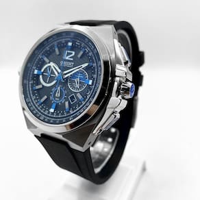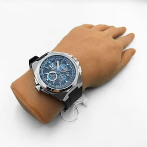 Características Formato do Relógio: Redondo Composição do Vidro: Safira Material da Caixa: Titânio Cor da Caixa: Prata Cor do mostrador: Azul, Cinza Material da Pulseira: Borracha Cor da Pulseira: Preto Mecanismo: Analógico Multifunção, Solar