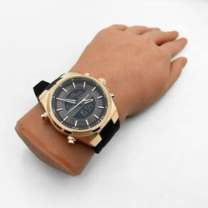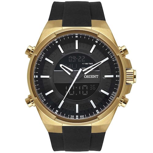 Características Formato do Relógio: Redondo Composição do Vidro: Cristal mineral Material da Caixa: Aço Inox Cor da Caixa: Dourado Cor do mostrador: Cinza, Digital Material da Pulseira: Borracha Cor da Pulseira: Preto Mecanismo: Analógico-Digital