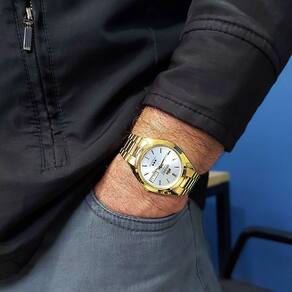 Marca: Orient Modelo: 469WC2F B1KX Tipo de relógio: Analógico Gênero: Masculino Cor da caixa: Dourado Cor da pulseira: Dourado Estilo: Casual Alarme: Não Cronômetro: Não Calendário: Sim Luz: Não – ponteiros fluorescentes Resistência à água: Sim – rotinas diárias Tipo de fecho: Dobrável Material da Caixa: Aço Inoxidável Material da Pulseira: Aço Inoxidável Características do vidro: Cristal Mineral Tamanho da caixa: 37 mm Espessura da caixa: 11 mm Comprimento da pulseira: 23 cm Largura da pulseira: 16 mm Tampa do fundo: Rosqueado Peso: 86 Gramas Alimentação: Automático Garantia do Fabricante: 12 meses Fabricante: Orient Relógios da Amazônia LTDA