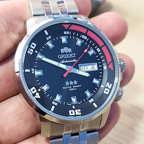 Marca: Orient Modelo: 469SS058F P1SX Tipo de relógio: Analógico Gênero: Masculino Cor da caixa: Prateado Cor da pulseira: Prateado Estilo: Casual Alarme: Não Cronômetro: Não Calendário: Sim Luz: Não – ponteiros e marcadores fluorescentes Resistência à água: Sim – 10 ATM = 100 metros Tipo de fecho: Dobrável, com trava de segurança Material da caixa: Aço Inoxidável Material da pulseira: Aço Inoxidável Características do vidro: Vidro mineral Tamanho da caixa: 45 mm Espessura da caixa: 15 mm Comprimento da pulseira: 24 cm Largura da pulseira: 20 mm Tampa do fundo: Rosqueado Peso: 146 Gramas Alimentação: Automático Garantia do Fabricante: 12 meses Fabricante: Orient Relógios da Amazônia LTDA
