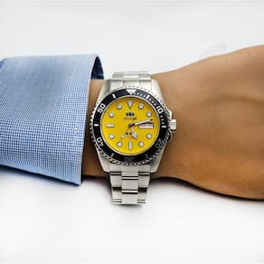 Características Formato do Relógio: Redondo Composição do Vidro: Cristal mineral Material da Caixa: Aço inox Cor da Caixa: Prata Cor do mostrador: Amarelo Material da Pulseira: Aço inox Cor da Pulseira: Prata Mecanismo: Analógico mecânico