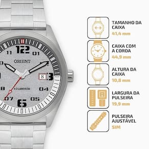 Ficha Técnica: Formato da caixa: Redondo Gênero: Masculino Cor: Prata Cor do mostrador: Cinza Material da Pulseira: Aço inoxidável Material da Caixa: Aço inoxidável Mostrador: Analógico Mecanismo: Solartech Nivel de Resistência à Agua: 3 ATM 30 metros Material do Vidro: Cristal Mineral Tipo de Fecho: Fecho Dobrável com botão Tipo de Coroa: Simples Fundo: Rosqueado