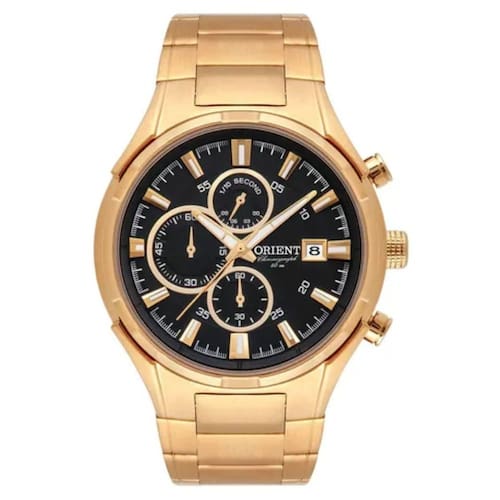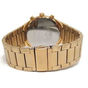 Características Formato do Relógio: Redondo Composição do Vidro: Cristal mineral Material da Caixa: Aço Inox Cor da Caixa: Dourado Cor do mostrador: Preto Material da Pulseira: Aço Inox Cor da Pulseira: Dourado Mecanismo: Analógico Multifunção